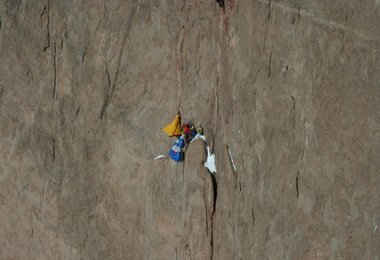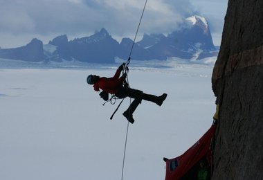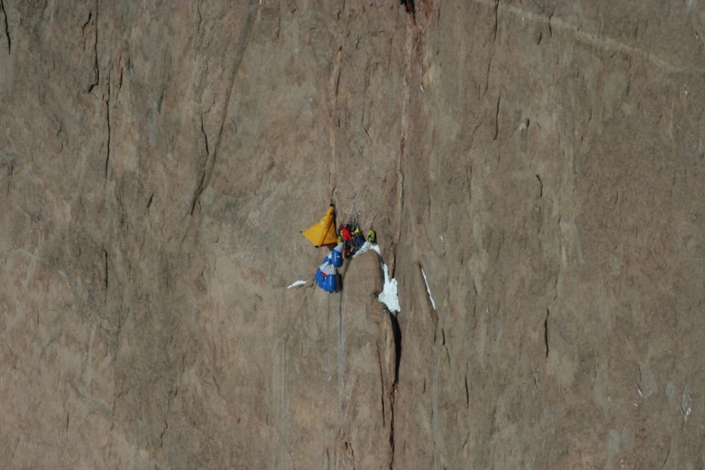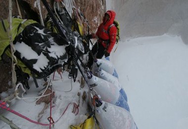 “Insgesamt verbrachten wir 40 Tage (2. Nov. – 10. Dez.) mit Klettern und Erkunden. Wir hatten großteils gutes Wetter und auch gute Kletterbedingungen, mit Ausnahme eines 48 Stunden Schneesturmes, den wir in halber Wandhöhe in unseren Portaledges aussitzen mussten. Die Temperatur lag im Schnitt immer bei -20° C. Wir kletterten im Semi-Alpinstil und fixierten die ersten 4 Seillängen von unserem Zeltlager am Fuße der Wand, bevor wir ganz in die Wand einsteigen und mit drei Biwaks bis zum Gipfel gelangten".
