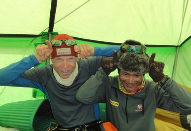Im Zelt badet Sepp seine rechte Hand in warmem Wasser. Er hatte sich die Fingerspitzen erfroren. Er erzählt uns, dass er beim Abstieg Sehstörungen bekam und Jyamchang darauf aufmerksam machte. Der Sherpa erkannte den Defekt an der Sauerstoffmaske (Reservoirbehälter) und gab ihm seine. Jyamchang stieg ohne zusätzlichen Sauerstoff ab. Eine menschliche und körperliche Höchstleistung, denn er hatte vier Flaschen im Rucksack. Ohne diese Hilfe wäre es vielleicht zu einem Desaster gekommen.