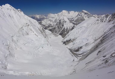 Immer wieder geht mein Blick zum Everest. Am Südgipfel sehe ich deutlich die Konturen von Menschen, die beim Abstieg sind. Ich freue mich über ihren Gipfelgang. Nach langsamem Aufstieg erreiche ich mit dem Amerikaner A.C.Sherpa gegen Mittag den berühmten Südsattel, Lager 4 auf 7.950 m. Eine kleine Zeltstadt steht hier. Ein bewegender Augenblick. Hier haben sich Hochgefühle und auch Dramen abgespielt.
