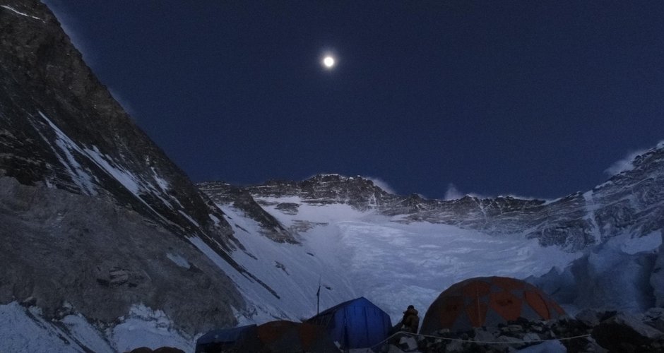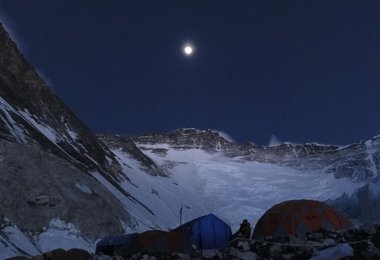 Es ist bereits Nacht, als wir uns um 20 Uhr Richtung Everestgipfel aufmachen. Der Mond leuchtet hell und lässt die Konturen erahnen. Einige Gruppen sind schon gestartet. Viele folgen fast gleichzeitig. Die Lichterkette der Stirnlampen wirkt unwirklich. Es ist kalt, aber es geht kein Wind. Die Orientierung ist einfach, da die Fixseile die Richtung vorgeben. Jeder von uns ist doppelt gesichert, mit Jümar und Karabiner.