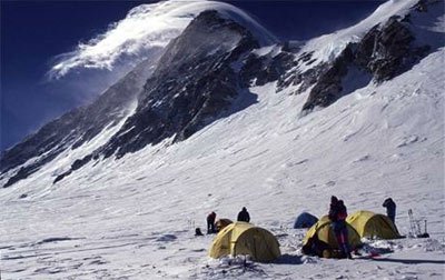 Nach 6 Tagen warten im Basislager schien endlich ein Windfenster zu kommen. Am 12.5 stiegen die beiden aus dem Basislager zum Lager 1 auf - bei Sturm. Dort waere das Unternehmen fast gescheitert. Der Sturm hatte das Zelt der beiden zerstoert. Alles war unter Schnee begraben. Es dauerte Stunden, bis die teilweise nasse Ausruestung geborgen und ein anderes Zelt bezogen werden konnte. Dann kam gegen 16.00 h ein Funkspruch, dass es die politische Situation (maoistische Unruhen) in Nepal es notwendig macht, am 16.5.04 aus dem Basislager abzureisen.