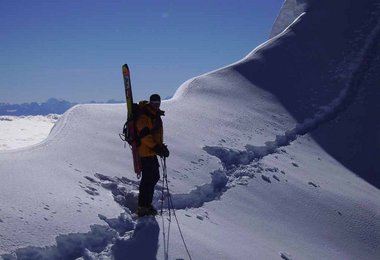 Von hier aus starteten wir um ein Uhr nachts, zunächst die Ski tragend durch den Eisbruch, dann mit Fellen bis zu den ersten Steilaufschwüngen und den großen Rest wieder die Ski tragend und trotz frischer Spur vom Vortag sehr anstrengend durch tiefen Neuschnee stapfend Richtung Gipfel. Nach bangen Momenten im Gipfelhang (Setzungsgeräusche und Risse in der Scheedecke, 45° steil) erreichten wir den Gipfelgrat und nach zwei Vorgipfeln standen wir bei wunderschönem, windstillem Wetter alleine auf dem Hauptgipfel des „Mittwochsberges“. Es war Mittwoch, der 28. September.