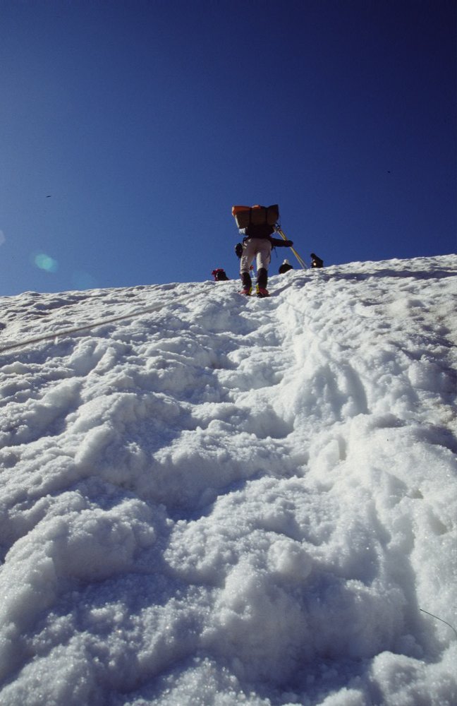 40 kg pro Person vom Basislager ins Camp 1 auf 5350m, absolut am körperlichen Limit und dazu leichte Kopfschmerzen, so stellen sich die wenigsten einen Urlaub vor. Wir verzichteten zu 100% auf Fremdhilfe und errichteten in weiterer Folge Camp 2 auf 6300m, einem herrlichen Plateau im ewigen Eis, vorausgesetzt das Wetter zeigt sich von seiner schönen Seite.