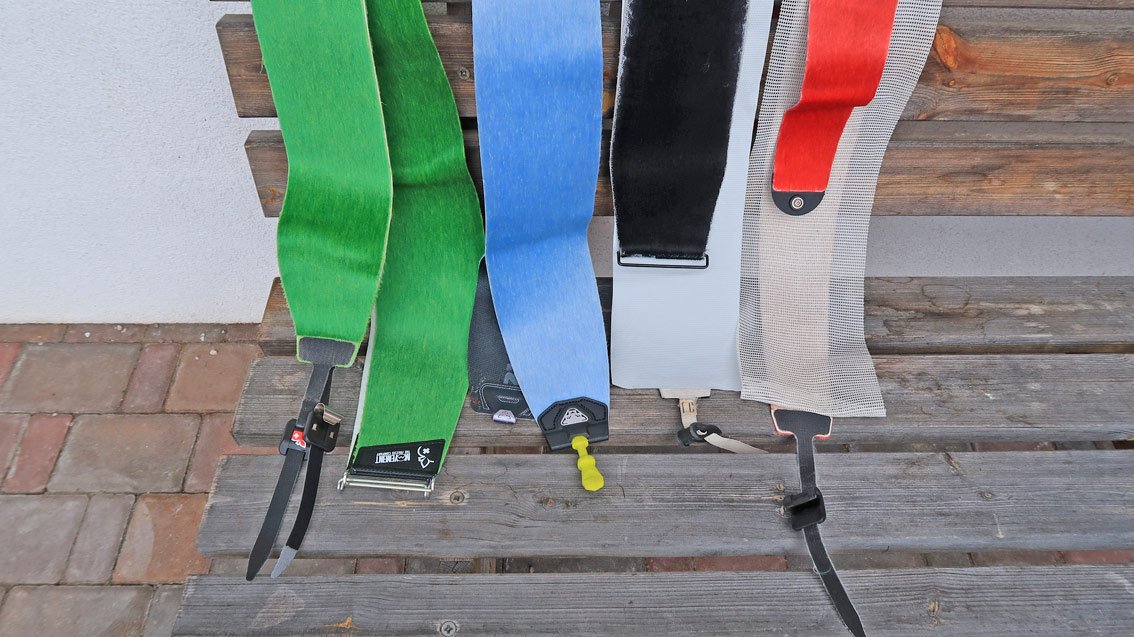 Normalerweise werden die Felle vorne und hinten auf dem Ski fixiert – die meisten Hersteller haben eine Fixierung (Spannung) hinten. Auch hier hat Pomoca bei seinen Fellen einen anderen Weg gewählt, das Fell wird an der Spitze gespannt. Dazu hängt man einfach einen dehnbaren Gummiteil in die Kerbe an der Skispitze ein, am Skiende ist nur ein starrer Haken. Geht natürlich nur, wenn der Ski an der Spitze die entsprechende Öffnung hat - viele Skimodelle haben das. Es soll aber auch schon Leute gegeben haben, die sich den kleinen Schlitz selber in den Ski gefräst haben….