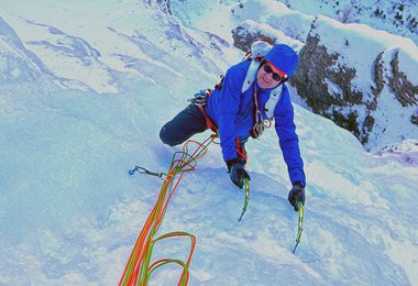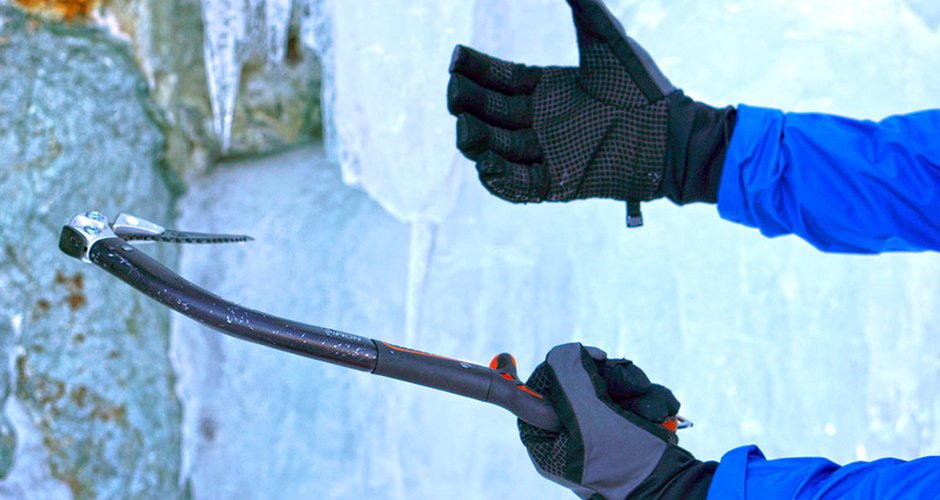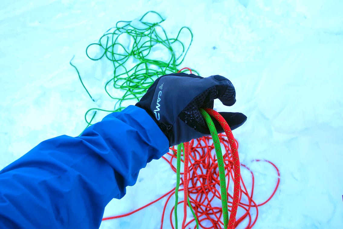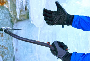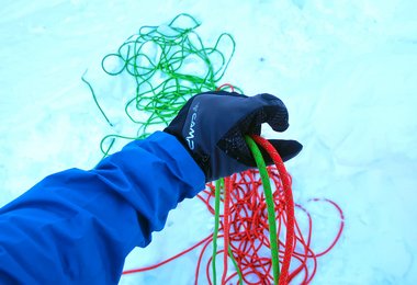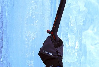 Beim Eisklettern ist es meist bitterkalt und man muss trotzdem sein Material - Eisgeräte, Karabiner und Eisschrauben - immer schnell und sicher bedienen können. Vor allem beim Setzen und Eindrehen der Eisschrauben werden die Handschuhe an gewissen Stellen stärker belastet, wenn diese wie beim Camp Geko Hot Evo etwas verstärkt sind, hält der Handschuh naturgemäß etwas länger. Beim Eisklettern gibt es im Grunde zwei Philosophien: beim High End Eisklettern hat man meist relativ dünne Handschuhe für den Vorstieg und wechselt am Stand auf dickere, warme Handschuhe, der "normale" Eiskletterer hat aber oft immer die gleichen Handschuhe an (wir ziehen uns am Stand oft einen Daunenfäustling darüber).