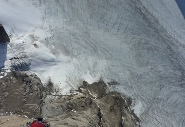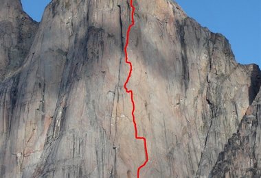 Nach elf Tagen gelang uns beinahe eine komplett freie Begehung, wobei wir die schwierigen Längen untereinander aufteilten. Da der Gletscher seit 1996 so stark zurückgegangen war, steckte nun der Einstiegsbohrhaken in 15 m Höhe. Jetzt hat die Tour eine neue Einstiegslänge im glattpolierten Fels. Nach einem fehlgeschlagenen Freikletterversuch schickten wir unsere Technoexpertin Silvia mit ihren Cooperheads, Hooks und sonstigen seltsamen Gerätschaften los. Sie meinte dazu nur „nette A4+“. In unserer Sprache bedeutet das, an Nr. 1 Cooperheads mit Groundfall-Potential herumhängen, ziemlich übel. Wir konnten diese Länge erst nach Toprope-Auschecken klettern -frei 5.12 / E8. Die meisten Längen gelangen auf Anhieb oder nach Auschecken, wobei wir versuchten keine Bolts zu schlagen. Die Route führt über großartige Risse und schwere Platten, die die Risse verbinden.