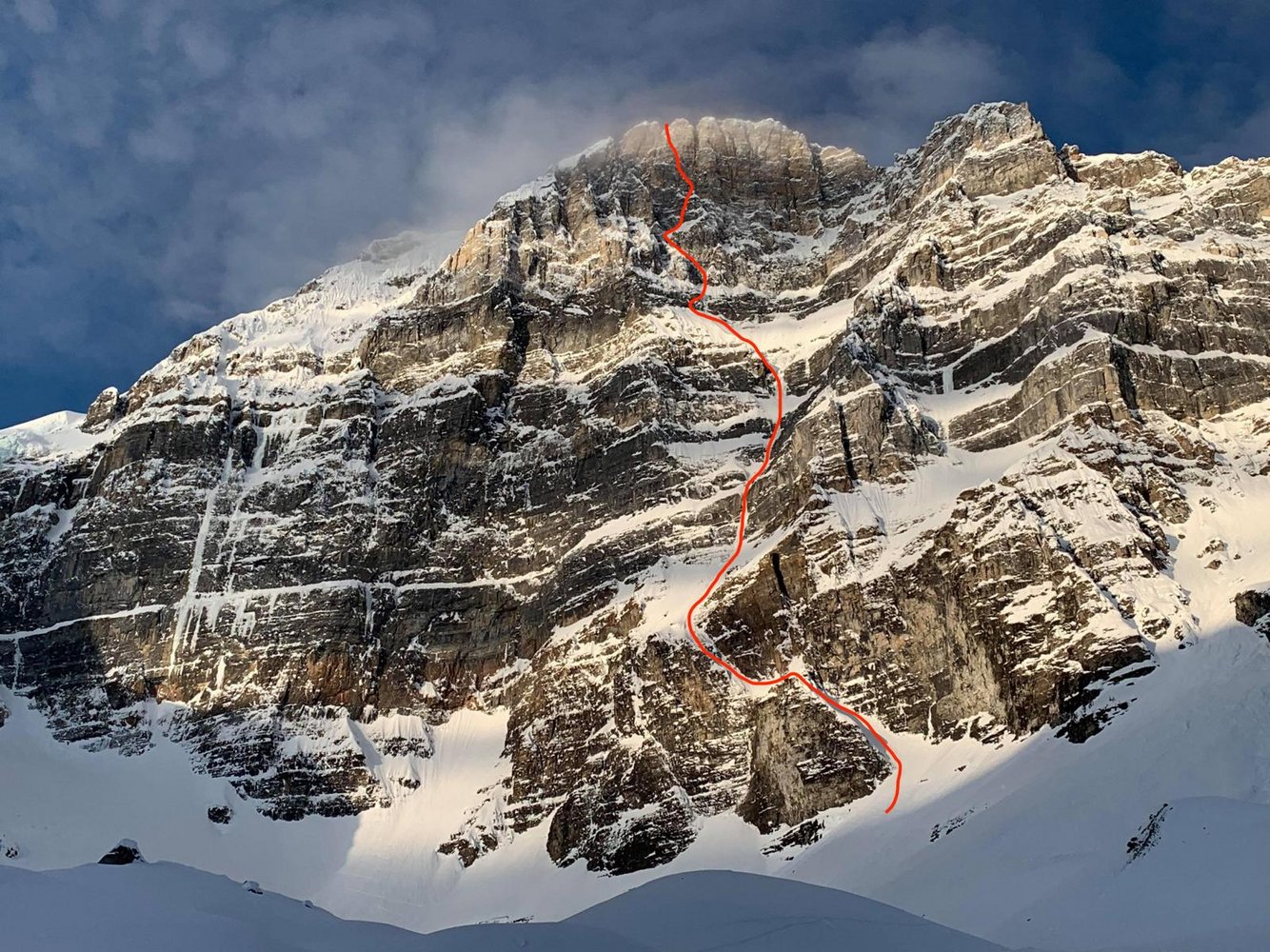 Charakter: Der erste Teil der Route folgt der Route aus 1984 über drei Eisstufen, mit etwas Schnee dazwischen. Dort wo das Team 1984 nach rechts geflüchtet ist, kletterten Harrington, Papert und Lindic gerade weiter. Die Headwall bietet steile und anspruchsvolle Mixed-Kletterei an oft brüchigen und nicht leicht abzusichernden Fels. Wiederholer sollten ein Biwak einplanen. Es empfiehlt sich auch die Tour an einem bewölkten Tag anzugehen oder in der Nach zu starten, da man sonst Probleme mit großen Spinndrift-Lawinen bekommen kann.