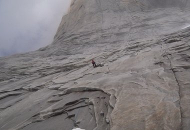 Das Team fand in der Route nur ganz wenige Bolts und Haken, was auf eine sehr respektable Leistung der Erstbegeher in der Saison 1973/1974 schließen lässt. Lediglich die Fixseile wurden von den zwei vorangegangenen Begehungen nicht entfernt und jetzt großteils aus der Wand gebracht.