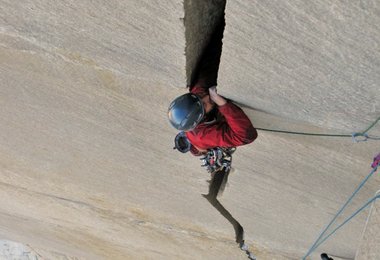 Die Route, die durch steile Risse und Verschneidungen führt, ließ sich im Großen und Ganzen gut absichern. Lediglich der Offwidth-Riss, der nach den zwei 7b+ Längen die dritte Crux bildet, war mit einem einzigen 6 Camelot etwas psychisch. Am 2. Februar erreichten sie den Gipfel. Hinter ihnen 13 anstrengende Tage und 1200 m perfekter Granit. Sie konnten alle Seillängen frei klettern, wobei sie 3 vereiste Seillängen erst nach dem Gipfelsturm befreiten.