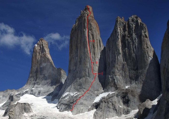 South African Route, Ostwand Central Tower, Paine, Chile Erstbegehung: Paul Fatti, Roger Fuggle, Art McGarr, Mervyn Prior, Mike Scott, Richard Smithers, 1973/1974