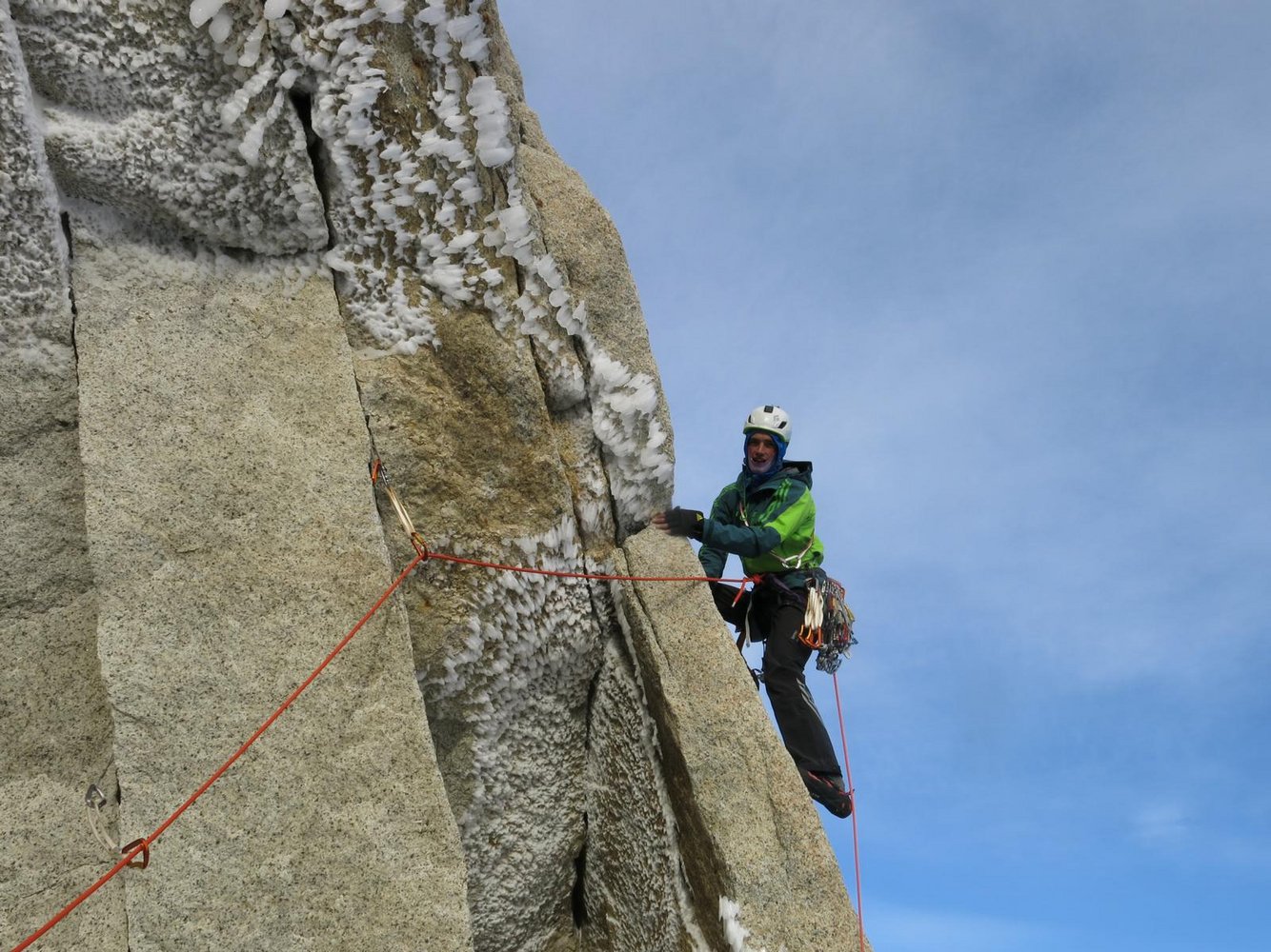 Wir haben das Jahr 2015 und ich bin wie vor 10 Jahren mit Andi Schnarf unterwegs und Tommy Aguilo aus Argentinien verstärkt unser Team. Verschiedene Wettermodelle geben uns eine gute Chance, endlich die Traverse realisieren zu können. Diese Motivation nehmen wir mit und steigen in der Nacht ins Col Standhardt am Klemmblock, der Start unserer ersten Route. 7 Stunden später erreichen wir den Gipfel des Standhardt und beim Abseilen ins Col Sueno peitscht uns ein starker Wind ins Gesicht. Wir seilen auf die Windgeschütze Ostseite ab, finden ein kleines Eisband für ein enges ungemütliches Biwak. Über uns an den Gipfeln der Torres pfeift ein Orkan, von den Eispilzen hagelt es Faustgroße Eisbrocken auf unser Biwak und später kam noch der Regen, perfekt, was für eine Nacht!