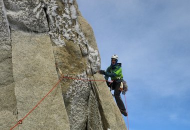 Nach dieser stürmischen Nacht am Morgen endlich Windstille, die Dämmerung verschluckt den Sternenhimmel, Ruhe, endlich. Wir schlafen eine Stunde bis die ersten Sonnenstrahlen uns motivieren. Es geht weiter und wir klettern so schnell es geht! 3 Stunden später stehen wir am Gipfel des Punta Heron und um 3 Uhr am Torre Egger!