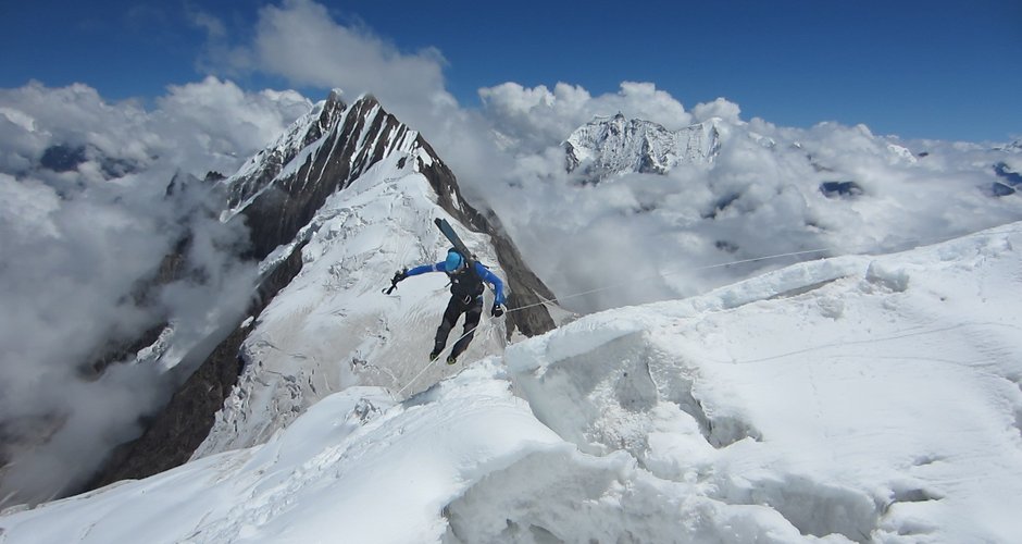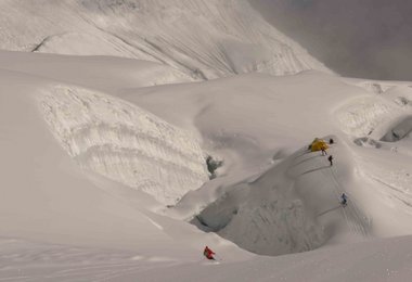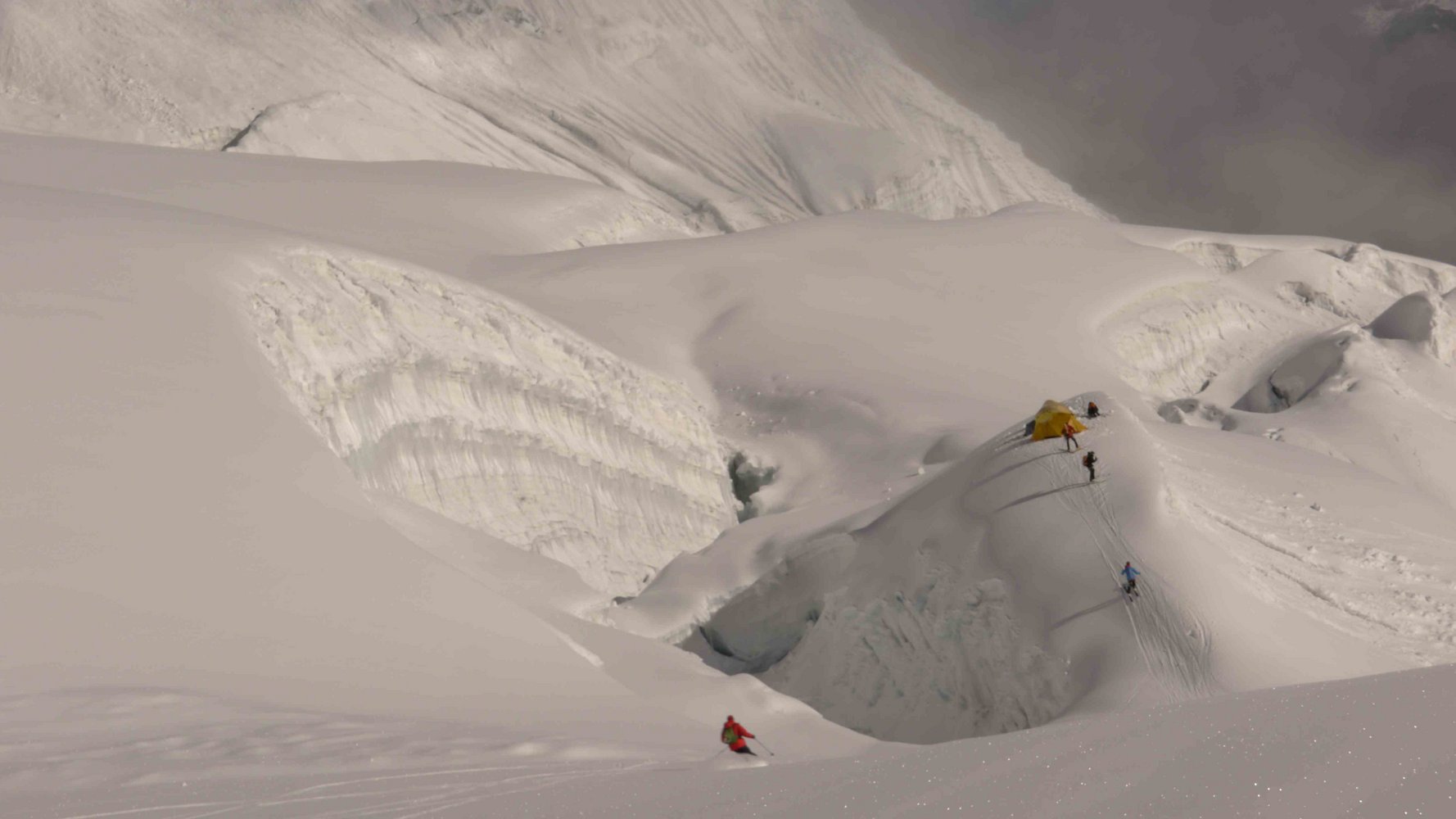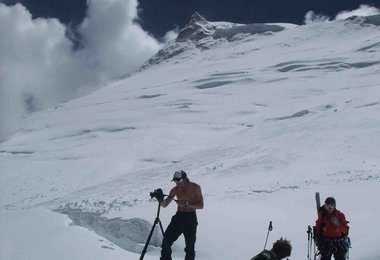 Die Athleten sind zur Akklimatisation auf Skiern unterwegs und erwischen auf den Abfahrten zwischen Lager 2 und dem Basislager (5.000 m) perfekte Schneeverhältnisse. Diese Glücks-Momente sind aber auch begleitet von anstrengenden Aufstiegen in der dünnen Höhenluft. Die Anstrengung steht den Extrembergsteigern ins Gesicht geschrieben.