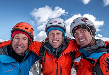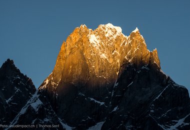 Am Kishtwar Shivling eröffneten Siegrist, Senf und Abegglen eine neue Route durch ein verstecktes Eiscouloir auf den OstgipfeL Der Ostpfeiler war mit Sicherheit schon zweimal versucht worden, bis anhin aber ohne Erfolg. Vom Biwak in einem Schneesattel auf 5400 Metern, kletterten die Alpinisten zehn steile Seillängen (bis zu 90°, Wl5) durch das Couloir. Anschliessend gelangten sie durch anspruchsvolles kombiniertes Gelände bis unter die gigantische Gipfelwächte. Mit viel Glück und Gespür fanden die drei ein Loch, konnten durch die Wächte kriechen und so den Ostgipfel erreichen. Das GPS zeigte 5895 Meter über Meer.