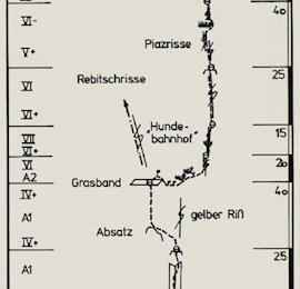 Die nächste Seillänge ist die schwerste der ganzen Tour, und wir wissen nun, warum die Erstbegeher ihren Weg "Pumprisse" genannt haben, wir pumpen nämlich wie Maikäfer beim Hochzeitsflug, nur sind Maikäfer in der Kehle nicht so ausgetrocknet. Die Seilkommandos schmerzen im Hals. Noch ein Rißdach, ähnlich dem in den Rebitschrissen, nur etwa doppelt ausladend und entsprechend schwerer, ein leichter werdender Kamin, der Ausstieg, Erschöpfung. Die Mittagshitze liegt wie ein schweres Tuch über den Latschen, so daß wir bald den Nordgrat absteigen; die heißen Füße schmerzen in den EB´s, jetzt verfluchen wir sie, vor kurzem noch waren wir überzeugt, ohne sie niemals diese Schwierigkeiten klettern zu können; die Hexentrics klingen wie Glocken, Kuhglocken, wenn sie aneinanderstoßen - Kühe fressen Gras, die Fata Morgana von Radlermaß und Käsekuchen verschwimmt im Bild der Pfeilerwand, die wir durchstiegen haben, der schwersten Freikletterei, die wir in den Alpen kennen; irgend etwas wie Befriedigung kommt auf. Doch schauen wir uns gegenseitig an, müssen wir nicht darüber lachen? Was sind wir denn für großartige Kletterer, schmutzig, zerrissene Hosen, durstig, ausgelaugt, mit Klemmkeilen und Karabinern behängt wie Weihnachtsbäume, zufrieden, glücklich - warum? Weil wir uns gequält haben, geschwitzt, geflucht, gefightet? Vielleicht ... (Quelle: Alpinismus, September 1977)