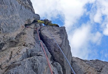 Die nächste Seillänge ist die schwerste der ganzen Tour, und wir wissen nun, warum die Erstbegeher ihren Weg "Pumprisse" genannt haben, wir pumpen nämlich wie Maikäfer beim Hochzeitsflug, nur sind Maikäfer in der Kehle nicht so ausgetrocknet. Die Seilkommandos schmerzen im Hals. Noch ein Rißdach, ähnlich dem in den Rebitschrissen, nur etwa doppelt ausladend und entsprechend schwerer, ein leichter werdender Kamin, der Ausstieg, Erschöpfung. Die Mittagshitze liegt wie ein schweres Tuch über den Latschen, so daß wir bald den Nordgrat absteigen; die heißen Füße schmerzen in den EB´s, jetzt verfluchen wir sie, vor kurzem noch waren wir überzeugt, ohne sie niemals diese Schwierigkeiten klettern zu können; die Hexentrics klingen wie Glocken, Kuhglocken, wenn sie aneinanderstoßen - Kühe fressen Gras, die Fata Morgana von Radlermaß und Käsekuchen verschwimmt im Bild der Pfeilerwand, die wir durchstiegen haben, der schwersten Freikletterei, die wir in den Alpen kennen; irgend etwas wie Befriedigung kommt auf. Doch schauen wir uns gegenseitig an, müssen wir nicht darüber lachen? Was sind wir denn für großartige Kletterer, schmutzig, zerrissene Hosen, durstig, ausgelaugt, mit Klemmkeilen und Karabinern behängt wie Weihnachtsbäume, zufrieden, glücklich - warum? Weil wir uns gequält haben, geschwitzt, geflucht, gefightet? Vielleicht ... (Quelle: Alpinismus, September 1977)