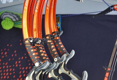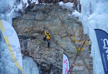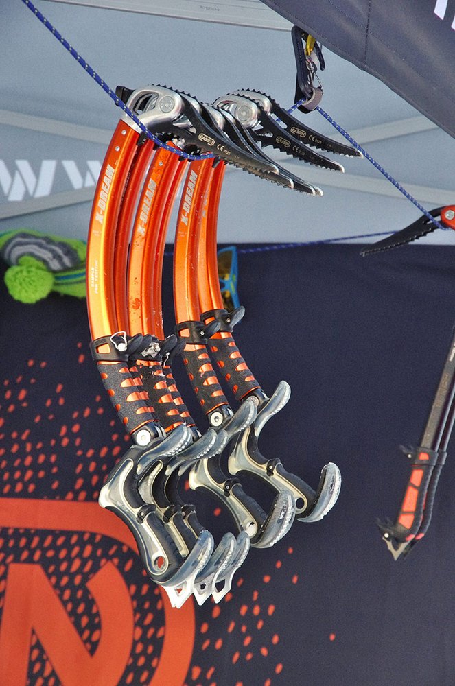 Neben den perfekten Eis- und Mixedklettermöglichkeiten gibt es beim Eisfestival aber noch einen weiteren Pluspunkt - die Herstellerfirmen, welche kostenlos die neuesten Eisgeräte und Steigeisen bereitstellen. Man kann selber ausprobieren, welches Eisgräte den besten Schwung hat und welcher Griff einem beim Blockieren in der Mixedroute am besten in der Hand liegt. Bei den Steigeisen kann man austesten, ob man sich mit Mono- oder Duozacken in steilen Eiszapfen am wohlsten fühlt.