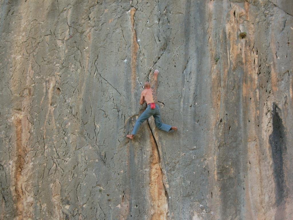 Am Limit und ohne Seil kann ich natürlich nicht vollkommen kontrolliert klettern. Es besteht die Gefahr zu stürzen, auch ohne Griffausbruch usw. Mich reizt der Nervenkitzel und wie in der Vorbereitungszeit fast alles andere an Bedeutung verliert. Das Barfussklettern liegt mir und es macht mir Spaß. Ich fühle gerne den Fels, auch wenn es manchmal weh tut.