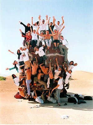 Gefahren wird mit dem "Big Red" einem Supertruck mit Boulderwand. Du kannst zwei Wochen oder ein ganzes Jahr mit dabei sein.
