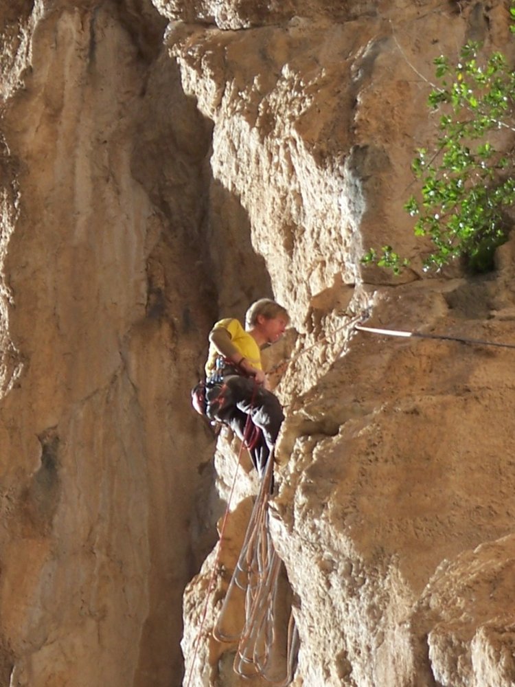 Andreas: An so einer Aktion hängt wesentlich mehr, als man so vermuten mag. So ist die Schlucht nur über einen mindestens 1 ½ -stündigen Fußmarsch zu erreichen. Pro Seillänge kann man dann etwa einen Zeitbedarf von einer Stunde kalkulieren, da das „Management“ des Doppelseils und des Materialseils, an dem sich der Rucksack mit Bekleidung und Verpflegung befindet, einiges an Aufmerksamkeit erfordert. Ein „Seilverhau“ kostet schnell mal eine halbe Stunde Zeit. Zudem ist es nicht nur eine schwere Seillänge, sondern es gibt davon gleich drei (2x8b, 1x 8a+). Und auch die übrigen Längen erfordern volle Konzentration. – Alle bewegen sich im Bereich 7b bis 7c+, und vor allem in den leichteren Passagen in den oberen Längen sollte man keinen Sturz riskieren, da man wahrscheinlich Verletzungen davontragen würde, mit denen man aus eigener Kraft nicht mehr zurück an den Wandfuß kommt. Die Anforderungen an den Nachsteiger sind auch sehr hoch. Schwingt er beispielsweise an einem der teilweise längeren Hakenabstände aus der Wand, besteht die Gefahr, dass er ohne Chance auf Felskontakt am Seil baumelt und nur durch den Einsatz von Prusik-Schlingen wieder an die Wand kommt. Das kostet Zeit, die man eigentlich nicht hat. Das Abseilen über die Route ist auch sehr speziell. Wenn man die Route mal kennt, kommt man durchaus in 2 Stunden vom Ausstieg zum Wandfuß – anfangs dauert es wahrscheinlich doppelt so lang. Und der Rückmarsch dauert wieder 1 ½ h. Für eine Tagesaktion ist das alles also ausgesprochen knapp. Wir sind auch nie bei Tageslicht zurück gelaufen.