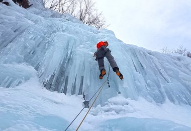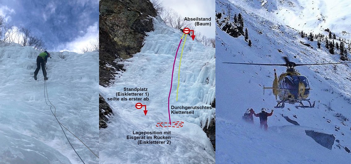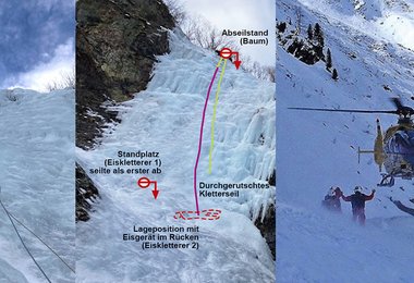 Die Eisgeräte - mit den Hauen nach unten - hängt man so in der Regel nicht an den Klettergurt. Man hängt diese an den Hauen ein (meist ist dort eine Öse für den Karabiner), die Spitzen der Hauen schauen nach hinten. Der Verunfallte war zum ersten Mal Eisklettern, dieser "Fehler" kann passieren. Das komplette Loslassen der leicht vereisten Kletterseile - im guten Glauben, dass der Prusikknoten blockiert - wollten wir aber genauer hinterfragen und haben deshalb Eiskletterprofi Vitto Messini um einen Kommentar gebeten und dieser meinte: "Ein kapitaler Fehler war sicher das Fehlen des Knotens an den beiden Seilenden. Wenn die Seile oder die Prusikschlinge ganz neu sind, kann es schon sein, dass der Prusik nicht sofort blockiert. Auch sollte man sich anschauen, wie dick das Seil war und ob der Tuber für die Seilstärke geeignet war (wenn das Seil zu dünn für den Tuber ist, ist die Reibung beim Abseilen naturgemäß viel kleiner). Die Eisgeräte hängt man in der Regel beim Abseilen mit den Hauen an die Materialschlaufen - Spitze zeigen nach hinten."
