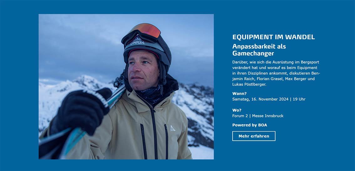 Die Alpinmesse mit Alpinforum ist Österreichs größte Bergsportmesse und findet gemeinsam mit dem Alpinforum vom 16. - 17. November 2024 statt. Ort ist wie immer das Messegelände in Innsbruck, welches man gut – auch fußläufig vom Hauptbahnhof – mit öffentlichen Verkehrsmitteln erreicht.