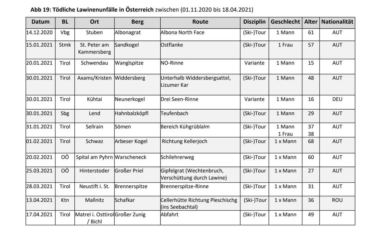 4 Tote sind in Österreich durch Lawinen im Zeitraum 01.11.2020 bis 18.04.2021 ums Leben gekommen, davon 8 in Tirol, 2 in Oberösterreich sowie je ein Lawinentoter in Vorarlberg, Kärnten, Salzburg und der Steiermark.