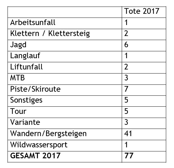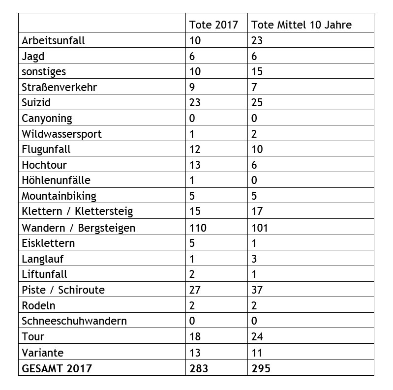 Die Bergsportdisziplin mit den meisten Unfalltoten im Jahr 2017 ist Wandern/Bergsteigen (110 Tote; 39 Prozent), gefolgt von tödlichen Unfällen im gesicherten Skiraum (Piste/Skiroute, 27 Tote; 10 Prozent).