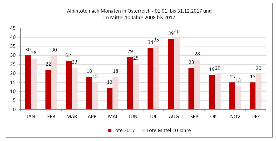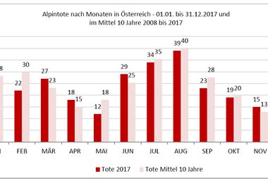 Der Bergsport ist stark von saisonalen Schwankungen und der Witterung abhängig, wobei die meisten Personen in den Sommermonaten unterwegs sind. Folglich ist auch die Anzahl der Alpintoten im Juli und August am höchsten. In unfallreichen Wintern kann es auch zu einer Verschiebung in die Monate Februar bzw. März kommen. Im Jahr 2017 war der August mit 39 Toten der unfallreichste Monat.
