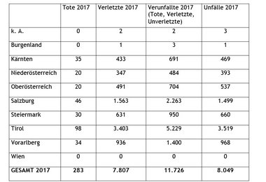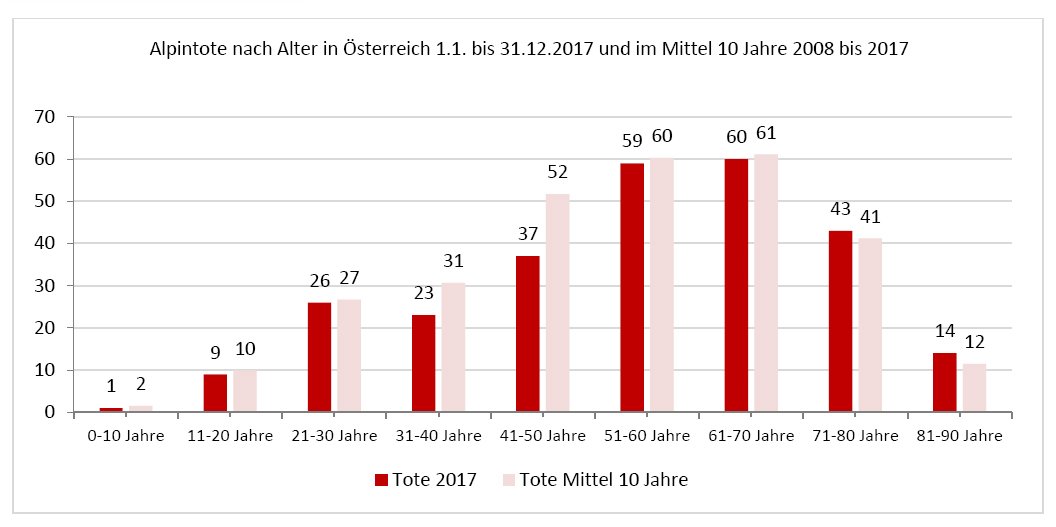 Die Altersverteilung der tödlich verunglückten Bergsportler sieht in Österreich für das Jahr 2017 wie folgt aus - siehe Tabelle.