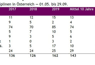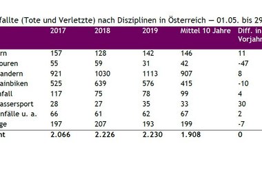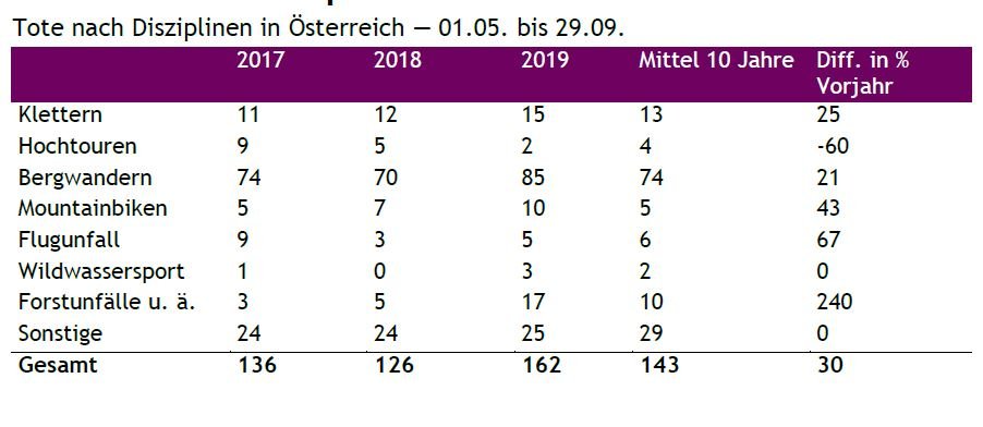 - Im Zeitraum 01.05. bis 29.09.2019 verunfallten in Österreichs Bergen 162 Personen tödlich (Mittel 10 Jahre: 143 Alpintote).