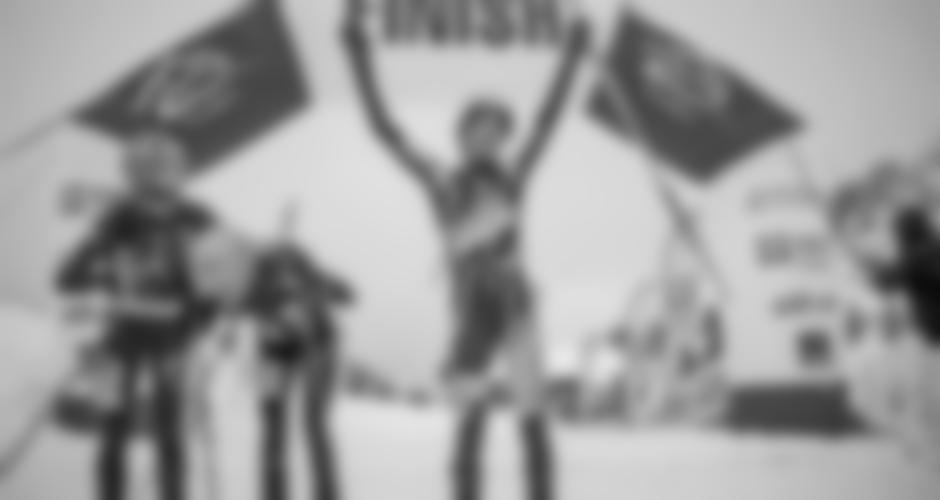 Andrea Mayr im Ziel mit den geschlagenen Athletinnen auf dem Podium; Bild: ISMF