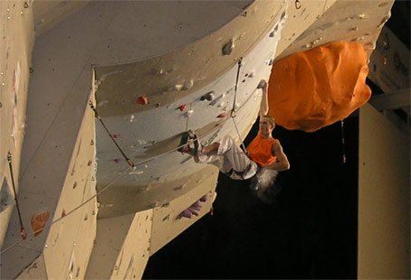 Der Deutsche Timo Preußler klettert der klassischen Ausdauerroute des Herrenfinales extrem dynamisch und motiviert auf den guten 6. Rang und macht vom vorletzten Haken (nach 29 Klettermetern) einen Rißensatz Richtung Boden. Er ist vor lauter Motivation die Express fast überklettert und machte statt dem Einhängen einen riesigen Abschlussdynamo.