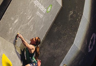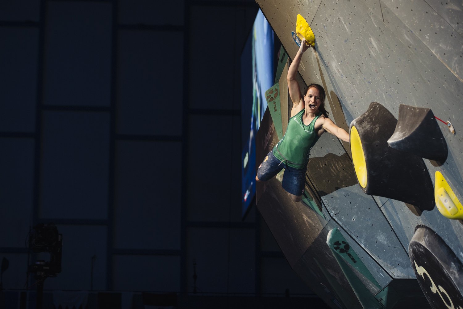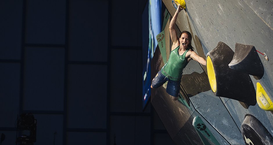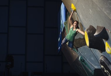 Anna Stöhr im Finale des IFSC Boulder Weltcups 2016 in Innsbruck. (Foto: Elias Holzknecht / KVÖ)