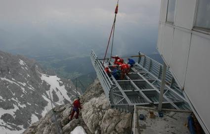 Einer der größten Lastenhubschrauber Europas („Super Puma“) war im Einsatz, um die rund 3 Tonnen schweren Teile des „Sky Walk“ auf 2.700 Meter zu transportieren. Auf der höchstgelegenen Baustelle der Steiermark war dann das Geschick der Monteure gefragt, die die einzelnen Bestandteile in luftigen Höhen in Empfang nahmen und sofort montierten. Der Pilot lies dazu seine starke Maschine (je 2000 PS auf zwei Turbinen, hebt bis zu 4,5 Tonnen Gewicht) ruhig über der Bergstation der Dachstein Seilbahn schweben.