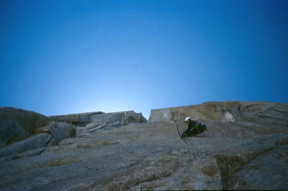 2 Tage später brechen sie wieder auf. Fast 3 Stunden benötigen sie für den Aufstieg an den Fixseilen. Es ist brutal anstrengend. Am Nachmittag fixieren Thomi und Hansjörg noch an die 150m mit den Halbseilen und einem kleinen Rest des Fixseiles. Die 3 Seillängen gleich oberhalb vom „Bed and Breakfast“ bleiben ihnen von der gesamten Route am besten in Erinnerung. 7a+, 8a und 7c+ folgen gleich hintereinander. Hansjörg führt den 8a California Crack. Nicht ganz senkrecht, dafür aber mit einer sehr gefinkelten Stelle am Schluss der Länge. In eleganter Piazkletterei geht es weiter, dann erreichen sie leichteres Gelände. Der Weg zum Gipfel ist frei. Sie seilen zurück zum Portaledge.