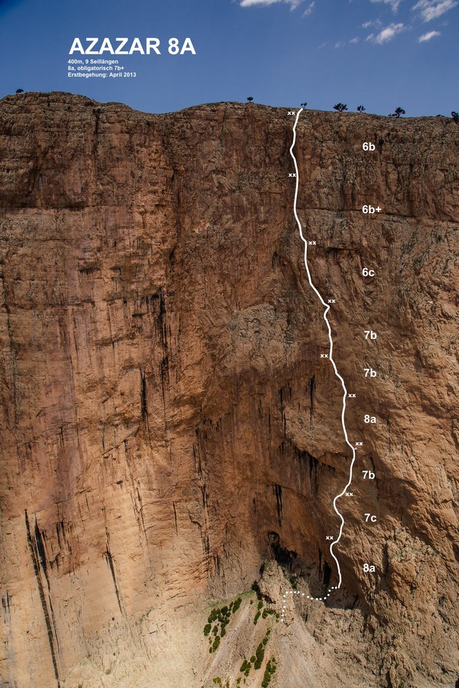 Als Routenname wurde Azazar gewählt. Azazar ist der Name einer wunderschönen Pflanze, die im Atlasgebirge wächst. Probiert man jedoch Ihre saftig grünen Blätter, hinterlassen sie einen bitteren Nachgeschmack.