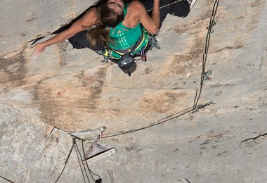 Ohne zu klettern, einfach nur bis zur achten Länge zu jumaren raubte mir schon einiges an Kraft. Daran zu denken, noch genügend Kraftreserven zu haben, nachdem man sieben schwierige athletische Längen hinter sich hat, war für mich unvorstellbar. Immer wieder waren die Griffe in der fünften Länge nass und es brauchte immer zwei trockene Tage, damit diese Länge wieder kletterbar war. Die Zeit rannte uns fast davon.