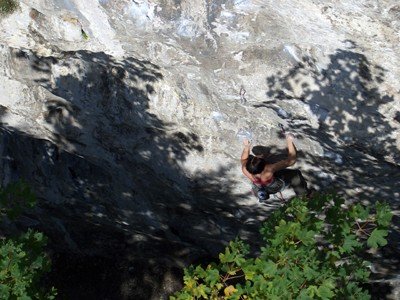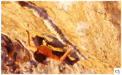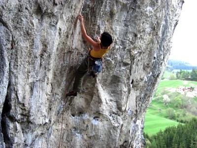 Genau dies fand ich auch zu Silvester 2003 in Slowenien mit „Sonce V Oceh, 8a+“. Aufgrund des boulderartigen Charakters reizte mich diese Route besonders. Erst kurz davor, habe ich dank einer Gruppe von dynamischen Boulderfreunden (u.a. Thomas S, Bernhard S und Andrea M) mit dieser spielerischen Form des Kletterns begonnen und konnte so binnen kurzer Zeit einen enormen Kraftzuwachs verzeichnen.