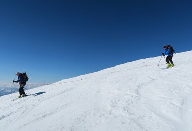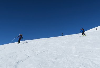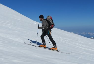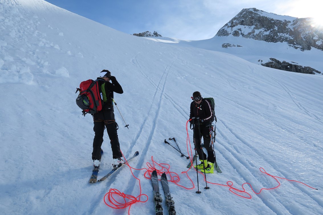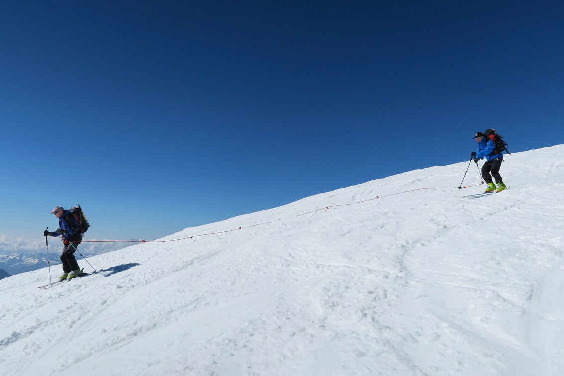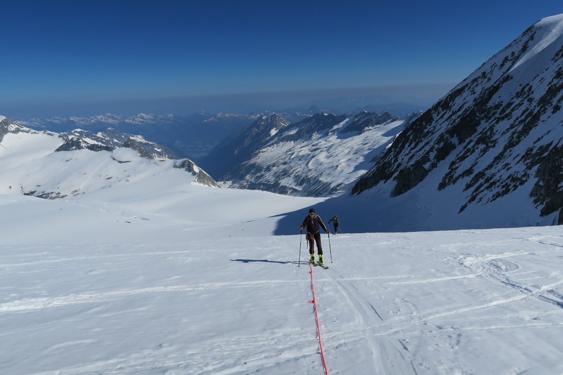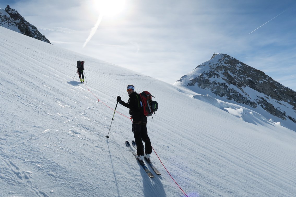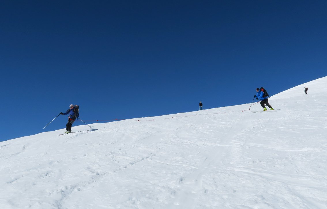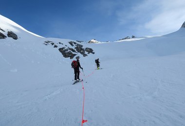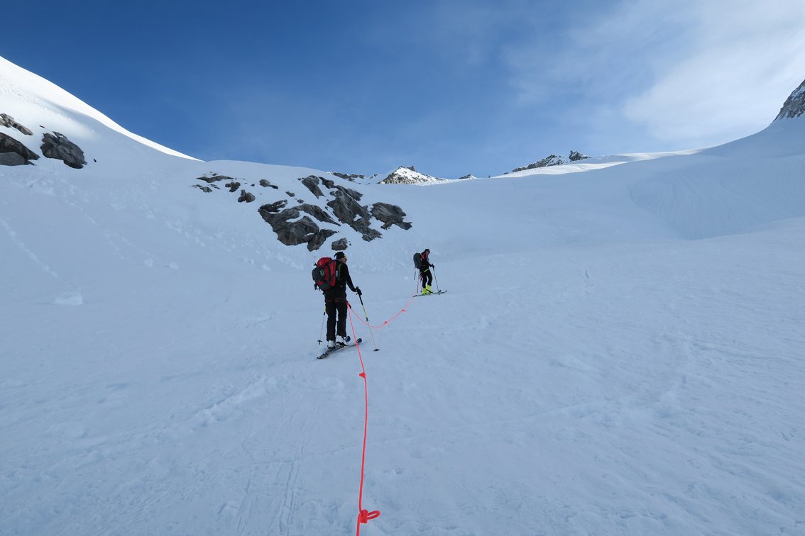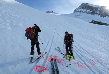 Nur angeseilt, kann man die Gefahr eines fatalen Spaltensturzes zumindest etwas minimieren! Bei Hochtouren im Sommer ist das Anseilen "Standard" und das Gehen ohne Seil die Ausnahme. Im Winter sieht das ganz anders aus. Angeseilt wird meist nur in schon auszumachenden Gefahrenzonen, also wenn man von Spalten quasi umzingelt ist. Bei Abfahrten und auch beim Aufstieg in größeren Gruppen wird das Seil als störend empfunden, es fehlt einfach das "Erlebnis" wenn man an der "Leine" seine Schwünge ziehen muss.