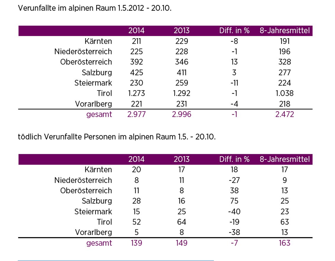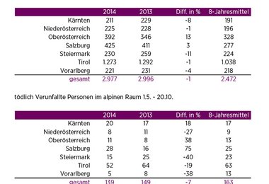 - Die Zahl der Verunfallten im alpinen Raum in der Sommersaison 2014 ist gegenüber dem Vergleichszeitraum (1.5. bis 20.10.) leicht zurückgegangen.