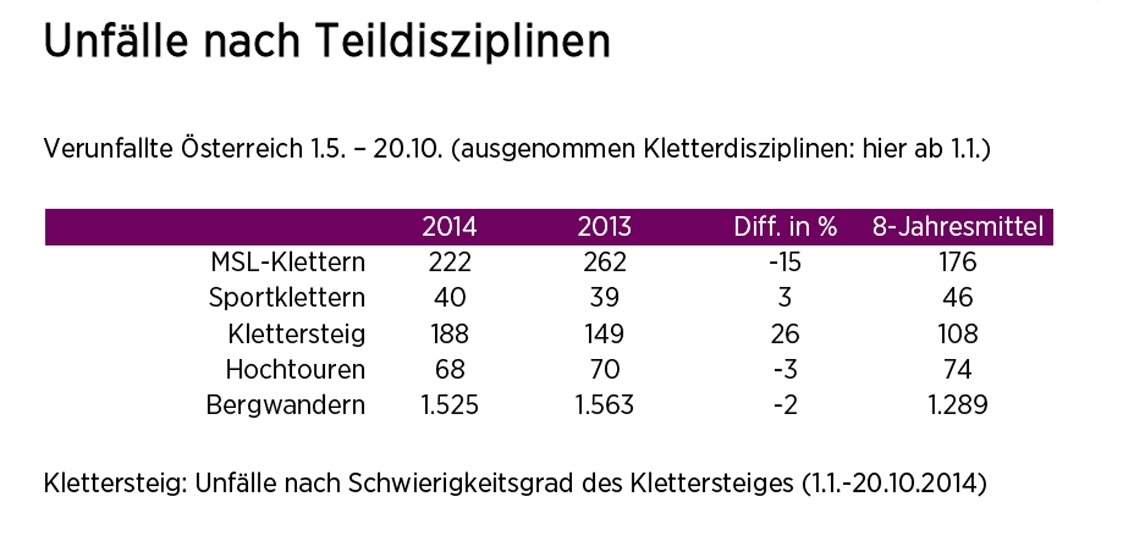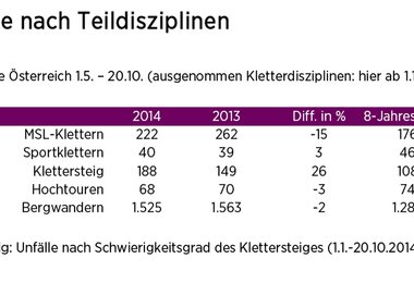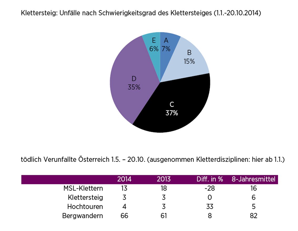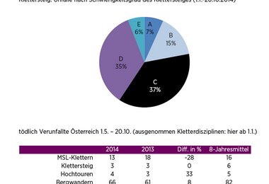 Sehr stark gestiegen sind die Unfälle auf Klettersteigen (Plus 26 Prozent) und stark zurückgegangen sind die Unfälle in MSL-Touren (-15 Prozent). Interessant dabei ist die Schwierigkeitsverteilung (Verunfallte/Klettersteigschwierigkeit), die meisten Personen verunfallen im mittleren Schwierigkeitsbereich (37 Prozent in C-Klettersteigen) und etwas darüber (35 Prozent in D-Klettersteigen). In den oft kritisierten Klettersteigen mit hoher Schwierigkeit (E-Klettersteige) sind nur 6 Prozent der Verunfallten zu finden.