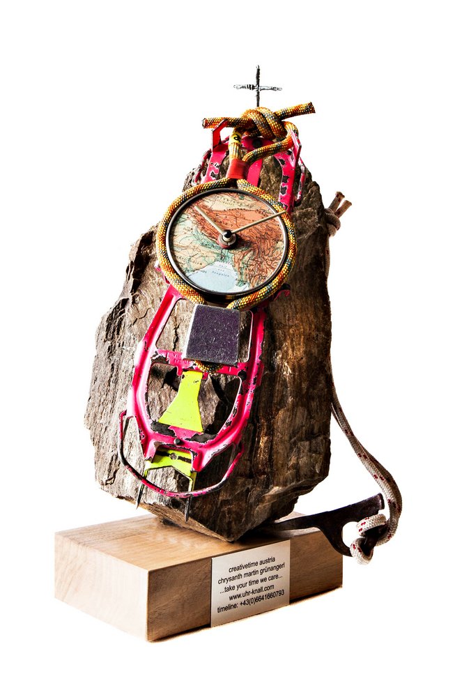 Ein Beispiel: Hans Kammerlander brachte mir nach meiner Bitte nach einen für ihn besonderen Stein einer seiner vielen Nepal Reisen mit. Dieser Stein wurde dann mit einem Steigeisen vom Everest und weiteren Ausrüstungsgegenständen zu einem Uhrenunikat gearbeitet. Ebenfalls zu sehen auf meinen Webseiten www.uhr-knall.com/bergzeiten