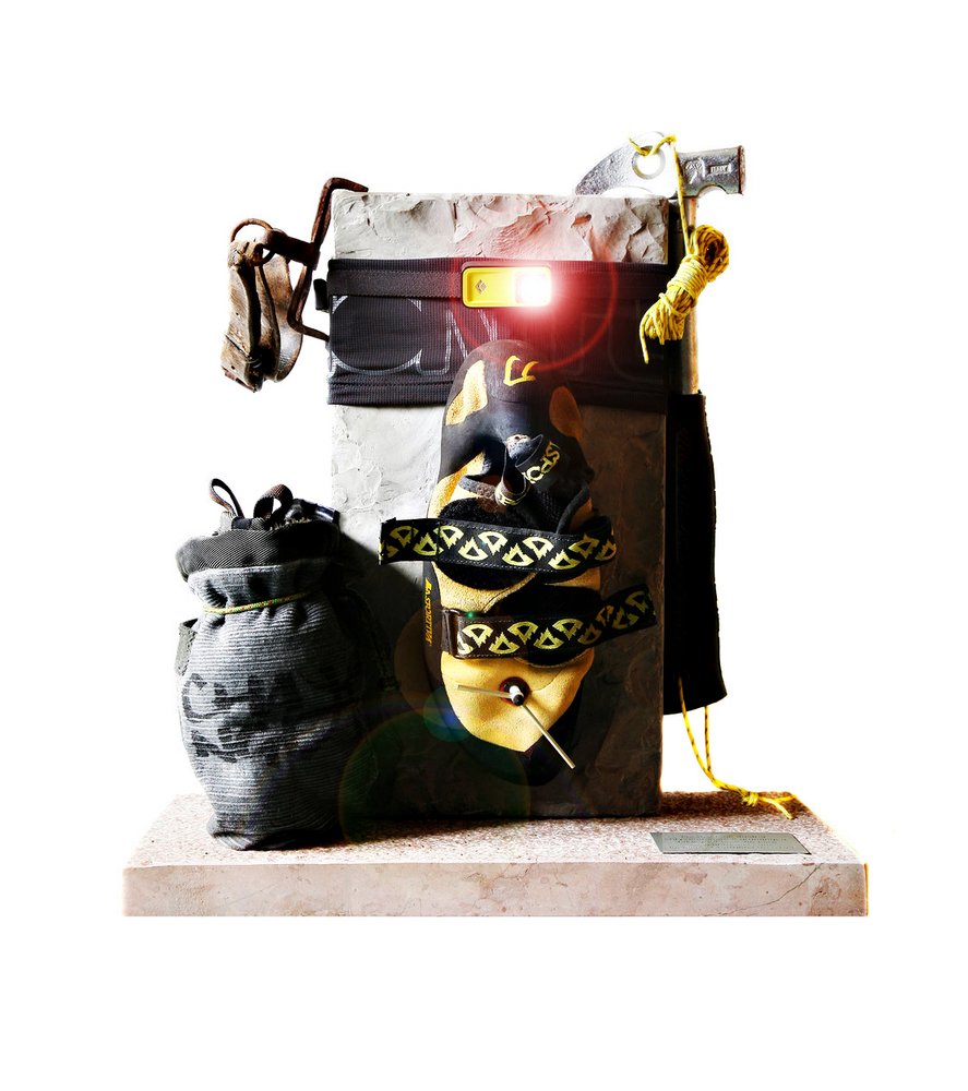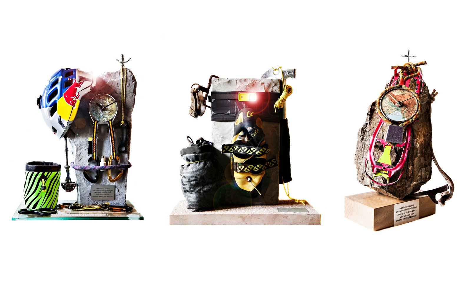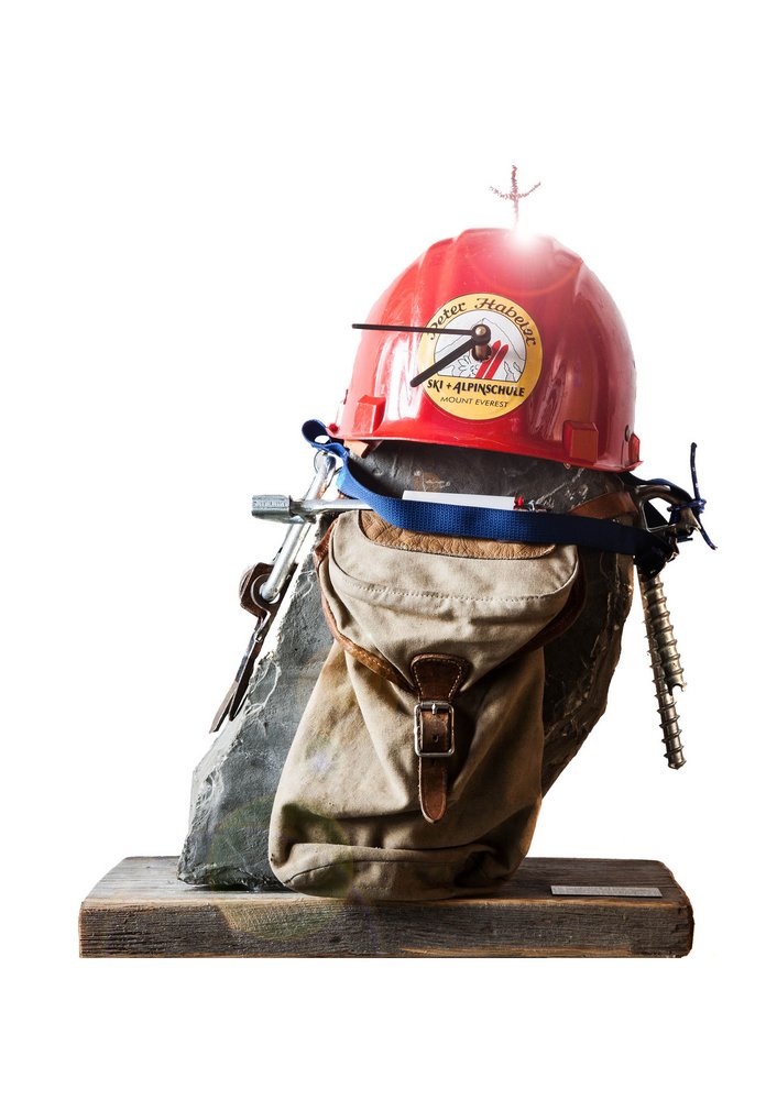 Materialien der Bergsteiger werden in das Design der „Bergzeiten“ eingearbeitet und stellen oft lebensrettende Ausrüstungsgegenstände für den Einzelnen dar. Jeder Mensch ist ein Unikat, wie seine spezielle Ausrüstung.