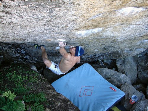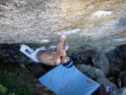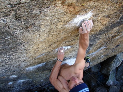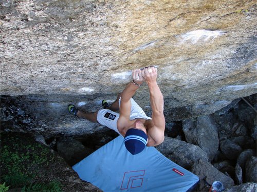 Das Frühjahr war sehr stressig und so wird es Mitte Juli, bis ich das erste mal die Moves probieren kann. Die Züge zwei bis sechs kann ich auf Anhieb klettern. Nur der Crux-Jump und der erste Zug gehen nicht. Kurze Zeit später hab´ ich eine Fußposition gefunden, mit der auch der erste Zug funktioniert und klettere anschließend gleich bis zum Jump durch - springe - bin aber weit davon entfernt, den Zug zu machen. "Ob das funktioniert?
