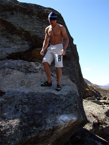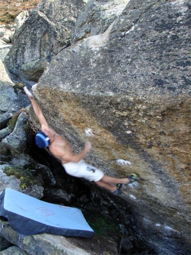 Zwei Stunden später glaube ich, nach einigem Umherirren, endlich in einem Bereich des Blockfeldes gelangt zu sein, der mir vom Blick auf den Staussee her, ziemlich "verdächtig" erscheint. Einige Augenblicke später stehe ich vor MEMENTO. WOW - Geniale Linie!!! Ich kann es kaum erwarten die Griffe auszugreifen - alles kleine Leisten - könnt´ mir liegen, auch wenn der Sprung sehr "scarry" aussieht. Nach einem erneuten "Ausgreifen" steht für mich fest, dass ich nächstes Jahr zumindest einmal herkommen muss, um die Züge zu probieren...