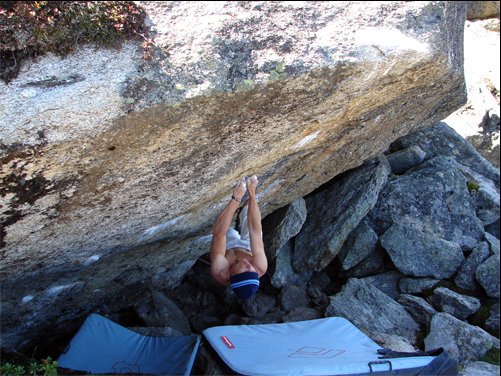 Etwa zehn Minuten vergehen bis zum zweiten Versuch - ich bin wieder völlig entspannt, gedankenlos und cool als ich einsteige. Die ersten Züge absolviere ich spielerisch - fühlt sich super an und macht mir sehr großen Spaß - intuitiv springe ich an der Crux - fühle wieder den Wulst und bleibe zu meinem Erstaunen hängen. Die Füße schwingen heraus, doch das Hängen und Schwaungabfangen funktionieren fast mühelos - ein Genuß - völlig perplex klettere ich noch auf das Top des Blocks ...