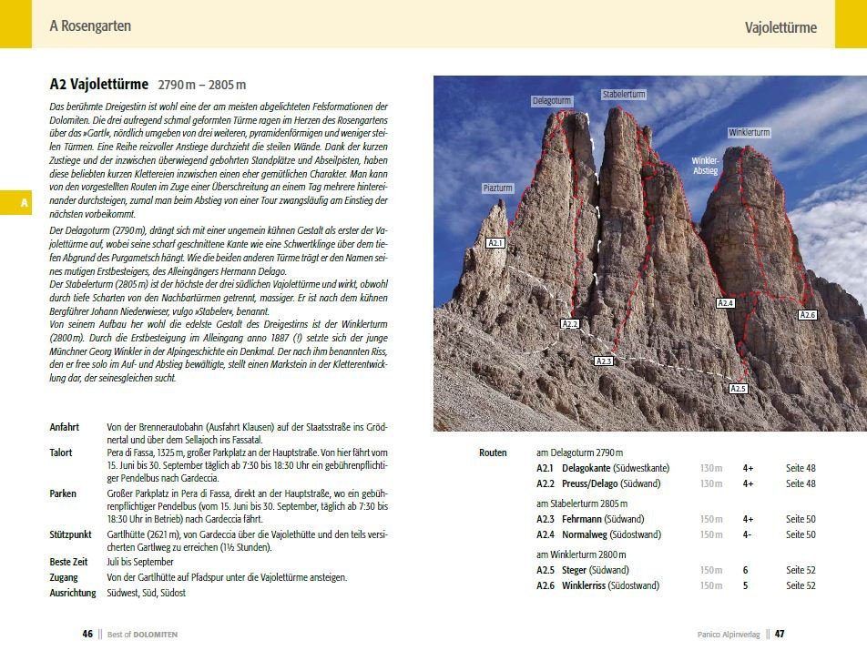 185 Routen sind detailliert beschrieben und mit superexakten Topos dargestellt, jede Route ist in einem aussagekräftigen Wandbild eingezeichnet. Der Schwerpunkt liegt auf den klassischen, gängigen Klettereien, die sich über Jahrzehnte hinweg als die besten Klettereien der Dolomiten herauskristallisiert haben. Die gebotenen Schwierigkeiten verteilen sich dabei zu gleichen Teilen auf die Schwierigkeitsgrade 4 bis 7, eine Handvoll Dreier und Achter schließen das Spektrum nach unten und oben ab.
