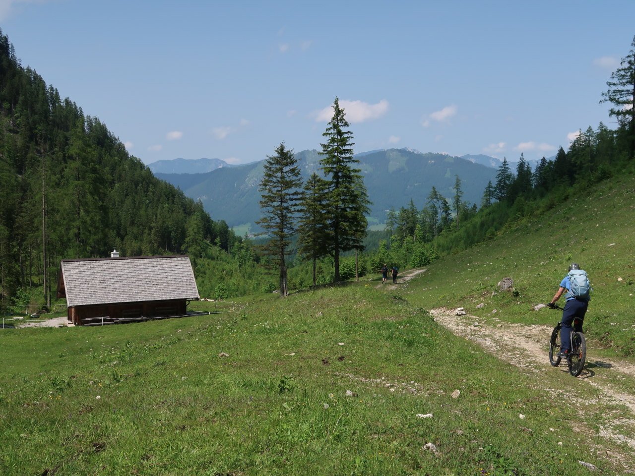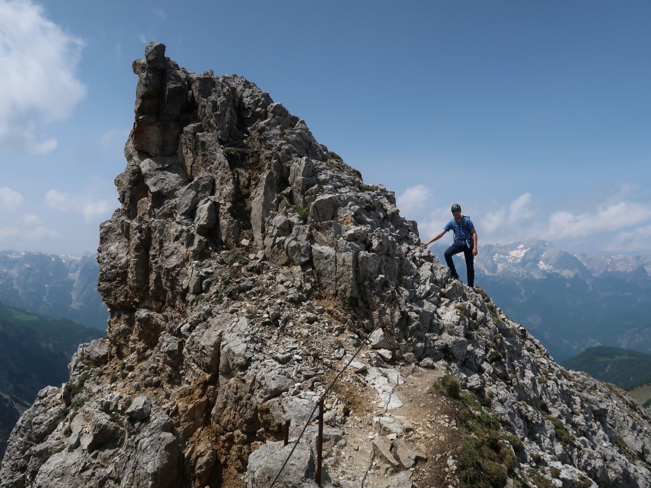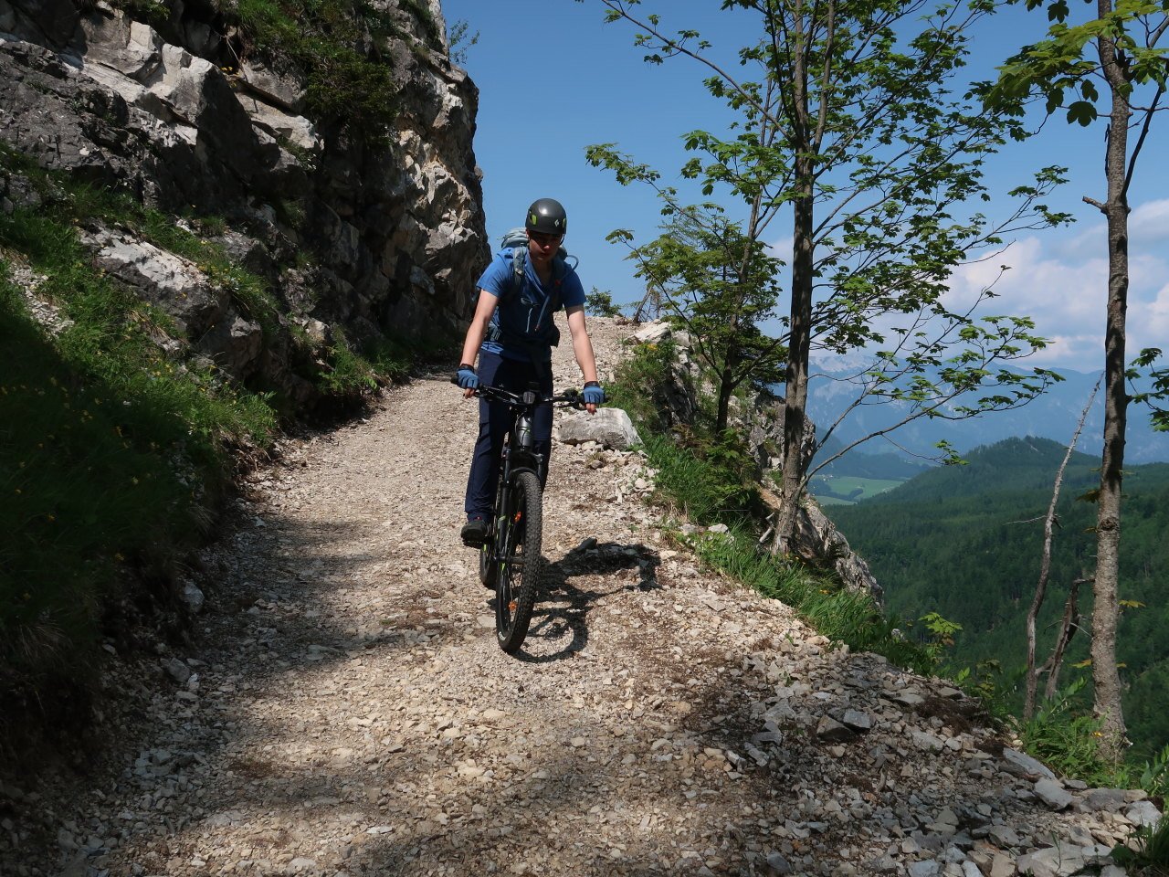 Stodertaler Klettersteig: leichter Klettersteig (B) mit sehr langem Zustieg auf die Spitzmauer (2446 m), Ausgangspunkt Polsterlucke (618 m, Wechselstation mit Lademöglichkeit), dorthin mit Bike oder Bus
