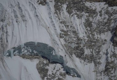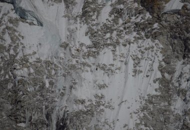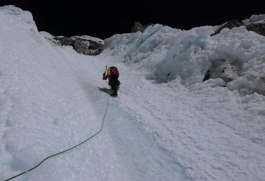 Mit der Dämmerung geht es mit dem Klettern los. Ich fühle mich noch ein wenig steif, aber dank des steilen Aufstiegs wird mir schnell warm. Die Wand wird immer vertikaler und die Schneefelder werden immer steiler. Aus dem Firnschnee wird Eis, gemischt mit großen Felsstufen. Nach zwei Stunden Simul-Klettern halten wir an einer 150 m hohen Felsbarriere. Ich sichere Radek und wir machen uns startklar für unsere erste große Herausforderung. Diese Felswand ist die obligatorische Eintrittskarte für die nächsten tausend Meter. Es gibt keinen Ausweg. Entweder schaffen wir es und können weiterklettern oder wir müssen wieder zurück ins Tal. Dabei ist noch nicht mal das Klettern selbst das zentrale Problem. Der gesamte Ort sieht aus wie ein riesiger Felsenregen. Ich probiere so schnell zu klettern wie möglich, um nicht von einem Felsen getroffen zu werden. Die nächste Herausforderung besteht in einer langen Durchquerung des zweiten Eisfelds, das oben links zudem Mixedklettern erfordert. Der Mixed-Teil sieht aus wie der Buchstabe «S» und beginnt mit einem kniffeligen Felsabschnitt, gefolgt von einer schmalen Verschneidung. Von unserem Standpunkt aus können wir sehen, dass die Verschneidung für unseren Versuch mehr als gut ausgestattet ist, mit großen losen Eisspalten, die aussehen wie majestätische Orgelpfeifen.
